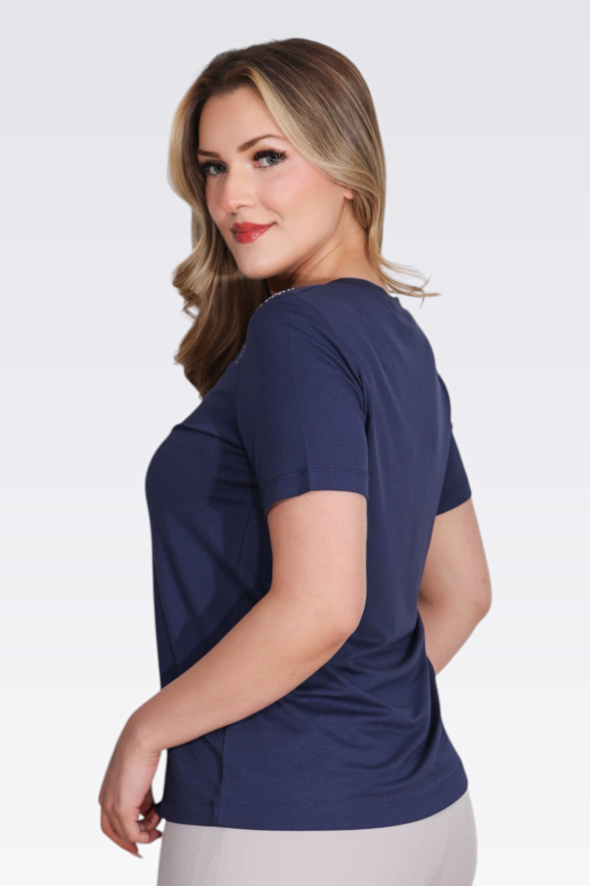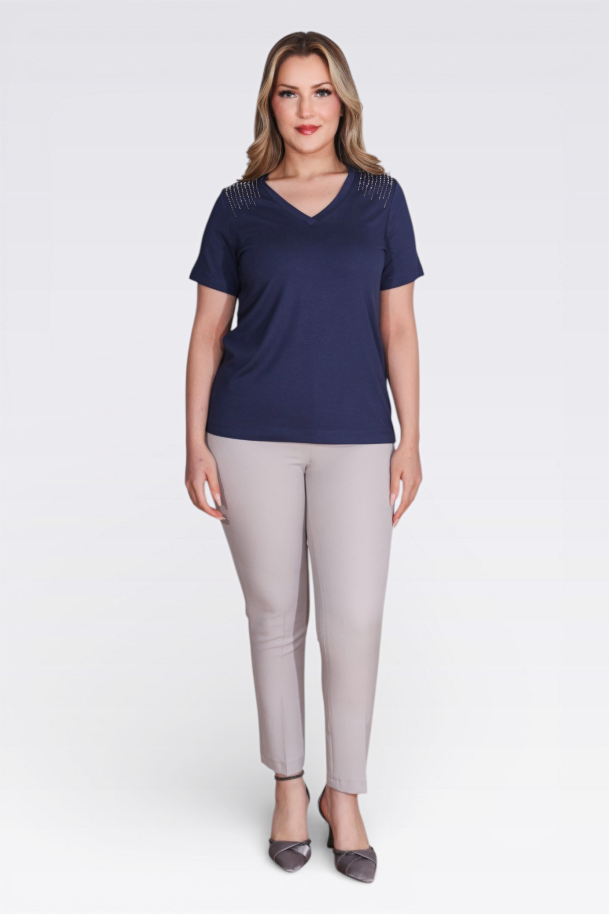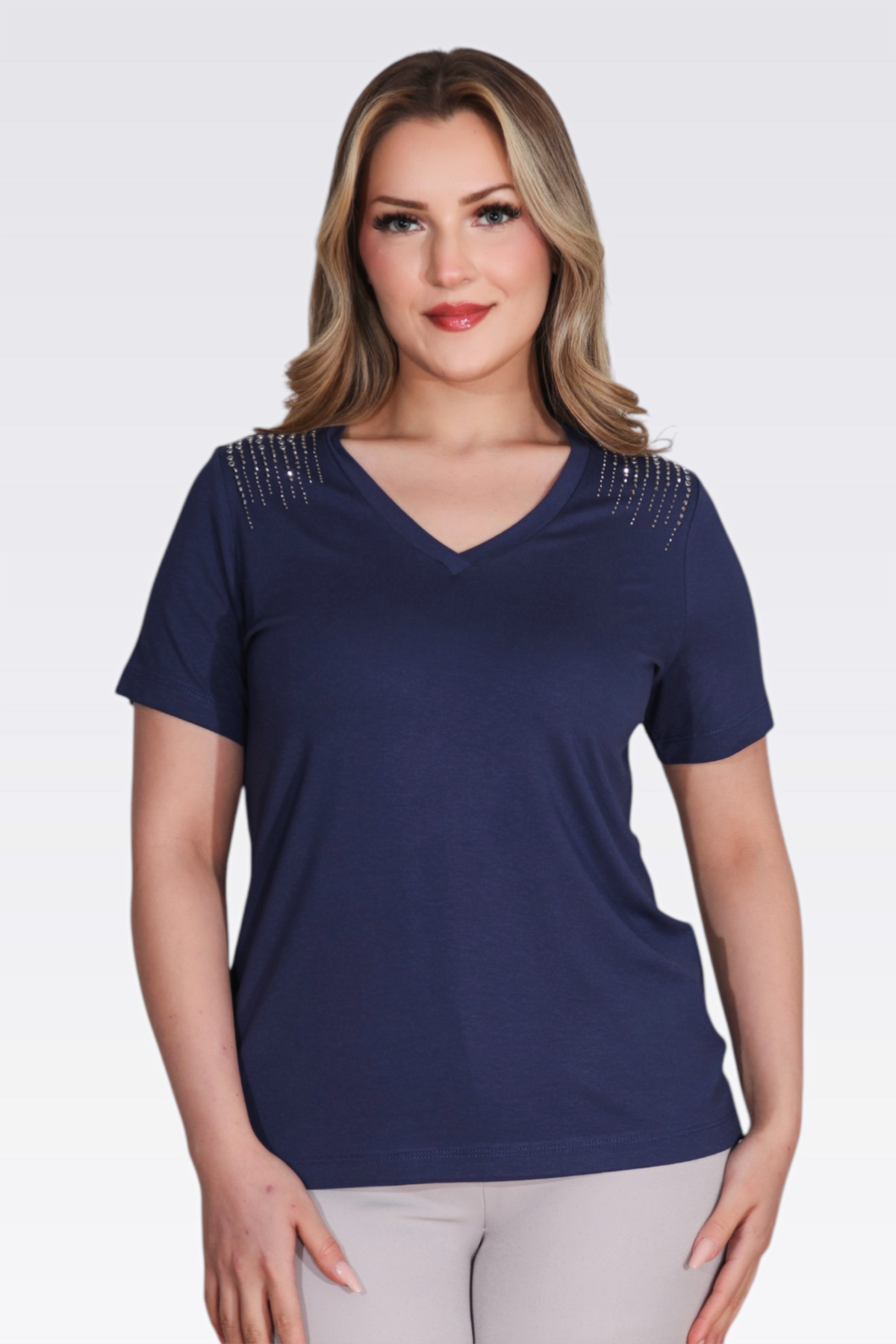 10744 TAŞ BASKILI V YAKA KISA KOL ÖRME BLUZ