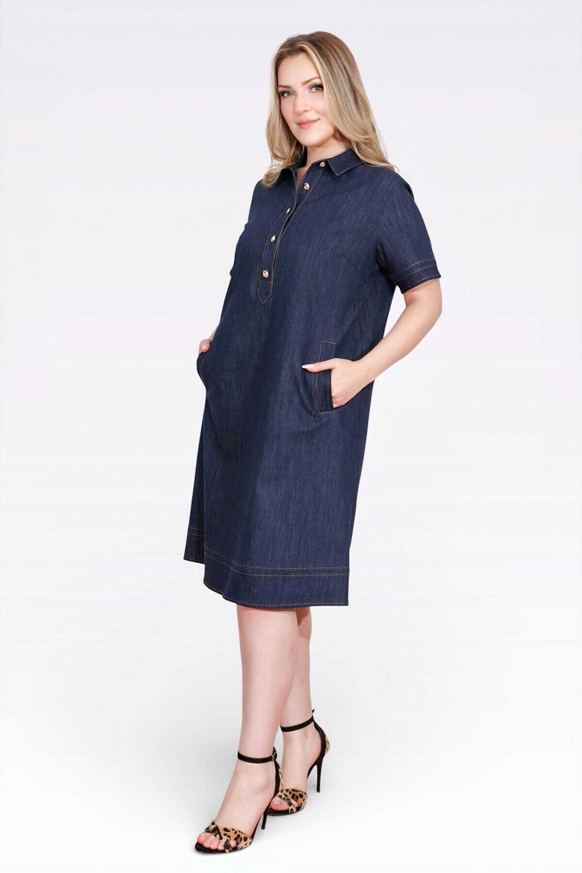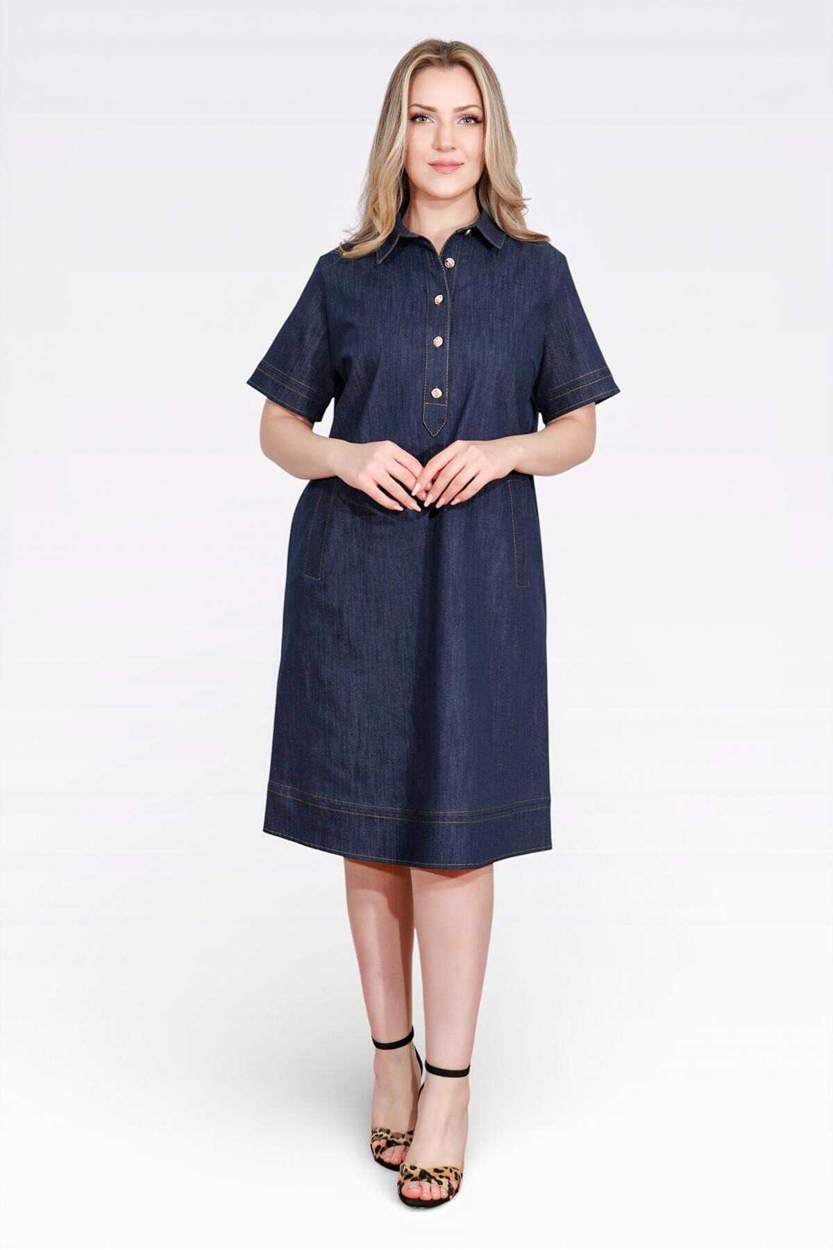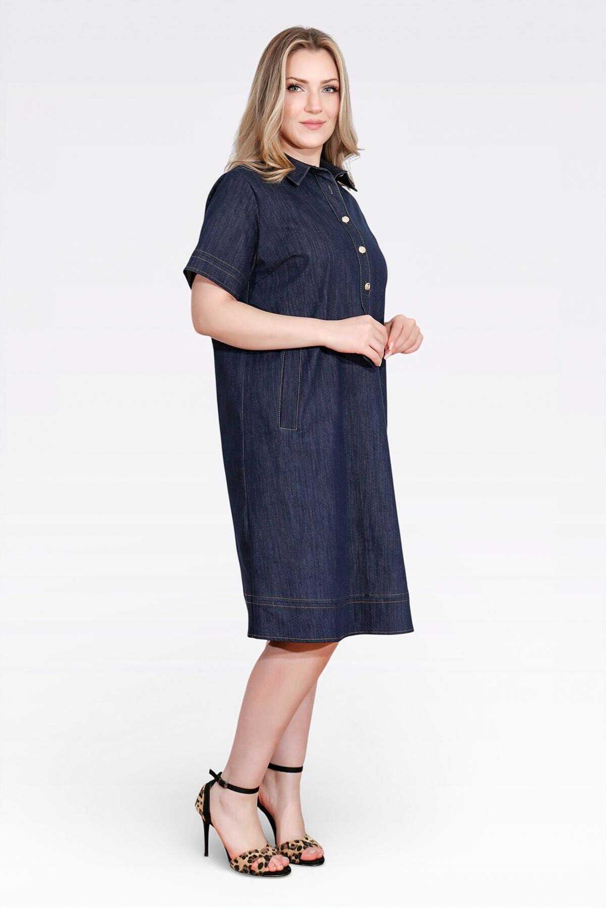 40218 ŞIK DÜĞME DETAYLI MİDİ BOY KISA KOL DENİM ELBİSE