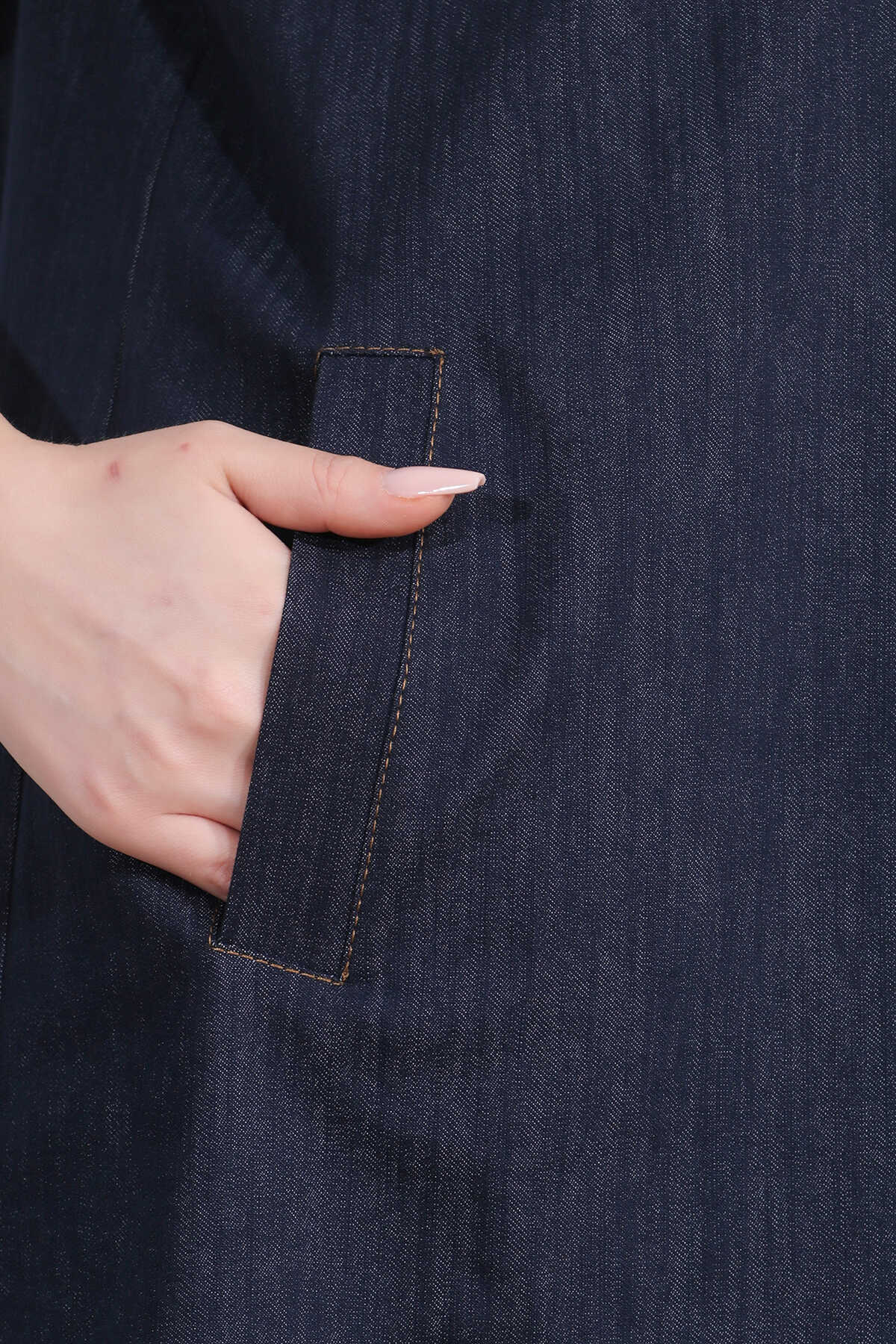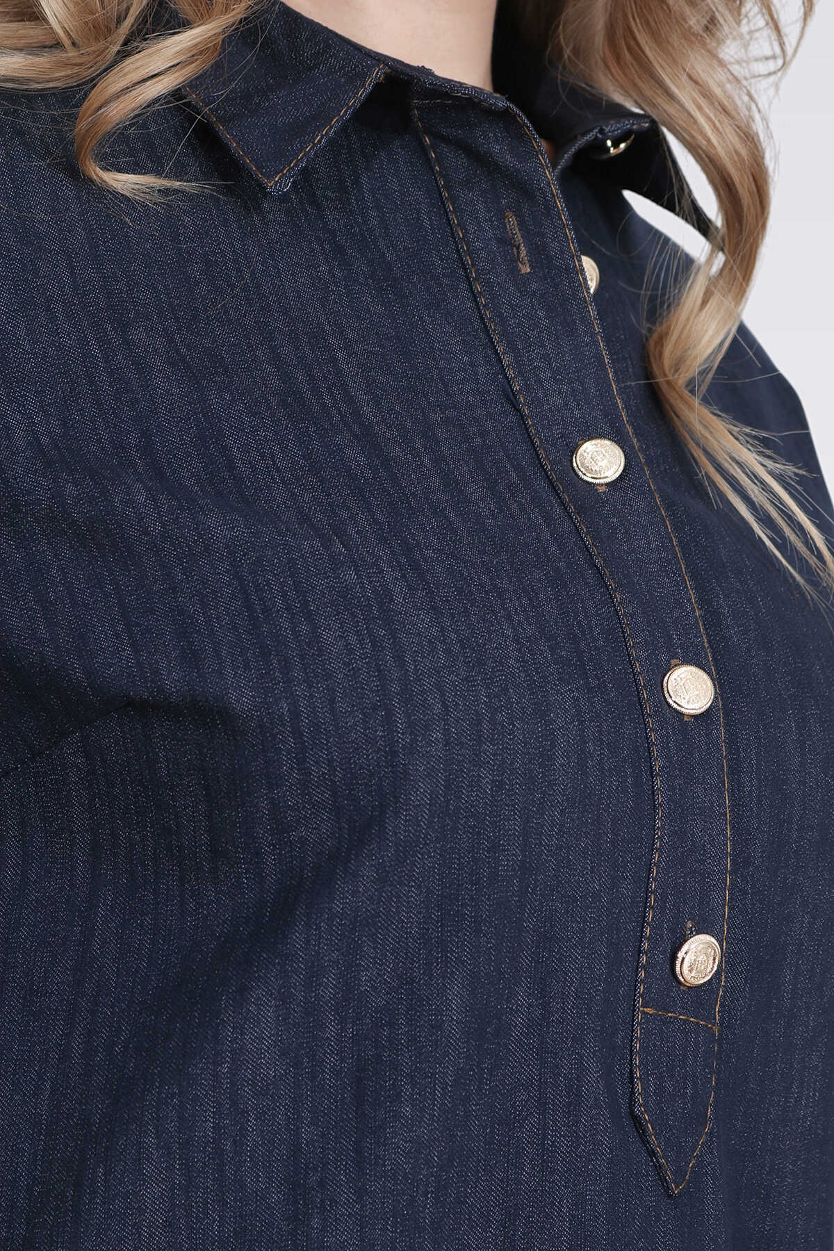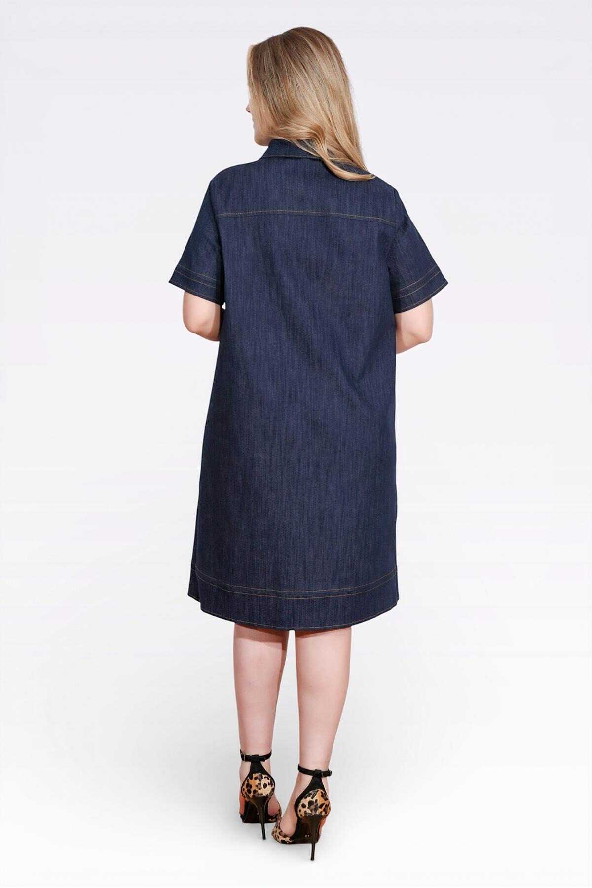 40218 ŞIK DÜĞME DETAYLI MİDİ BOY KISA KOL DENİM ELBİSE